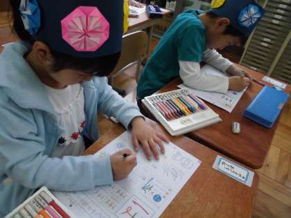 かぶったままひらがなの学習に取り組みました。