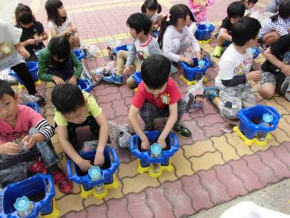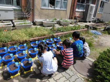 一つずつおもいをこめて人差し指を土に入れてそのあと,その穴に種を一つずつ入れていきます。水をかけてあげているときの子ども達の顔を見ていると,朝顔の種にも思いが伝わっているように思います。きれいな花が咲くように,毎日水やりをがんばろうね!!