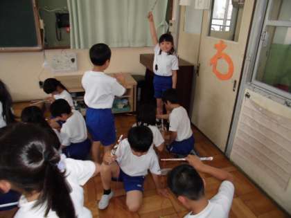 一人一本の手作り釣り竿を貰い,班で3分間で金魚が全て釣れるかどうかを