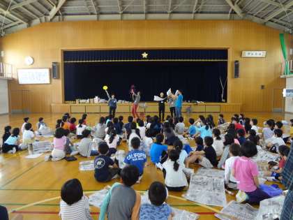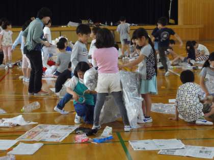 5月14日(月)の1・2校時に人形劇団の方とワークショップで劇に用いるカラスの制作をしました。夢中になってすてきな大きいカラスを作り,実際に動かしてカラスダンスもしました。