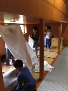朝6時、寝具の片付けをしています。