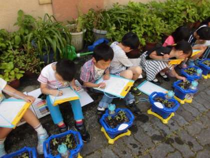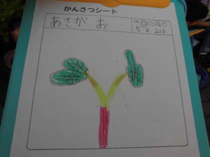 みんなのあさがおの芽がしっかり出てきてくれています。きれいにふたばが開いていて元気に育ってくれているのがよくわかります。一人ずつ観察カードを書きました。目で見た様子,触った感じ,にている形などいろいろな角度から見ていました。これからどんどん成長していくのが楽しみですね。
