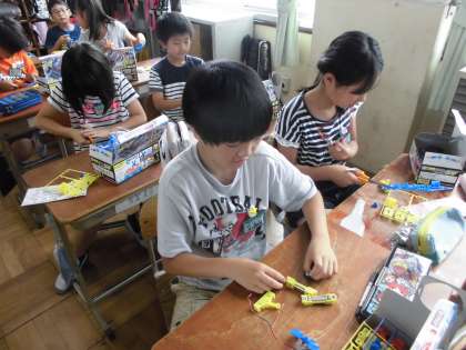 モーターを回すための回路作りです。上手に組み立ててモーターを回すことができたかな?これからモーターの回るようすから,乾電池などの電池のはたらきを調べていきます。