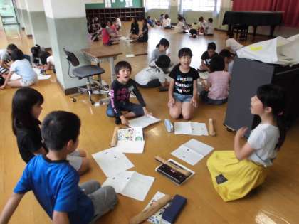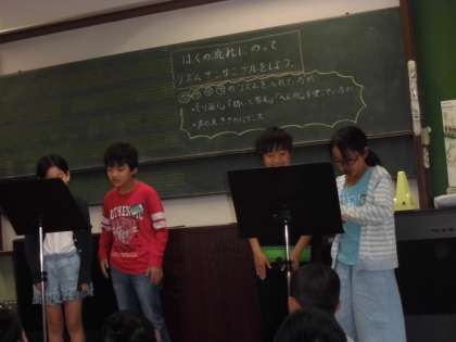 4文字の言葉を使って,リズムアンサンブルをつくりました。グループで協力して全部で8小節のリズムアンサンブルづくりです。本番ではAグループとBグループに分かれて発表しました。緊張しながらも自分たちで工夫して作ったリズムアンサンブルを立派に披露することができました。
