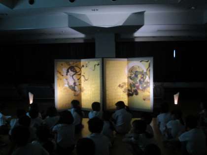 6月13日,6年生は,京都国立博物館の方による『京の文化財に親しむ授業〜俵屋宗達「風神雷神図屏風」〜』を受けました。照明で浮かび上がった風神雷神図は荘厳でした。江戸時代の俵屋宗達の筆使いを間近で感じることができました。