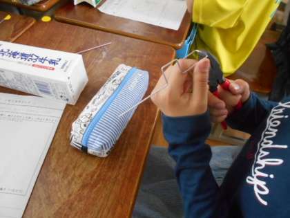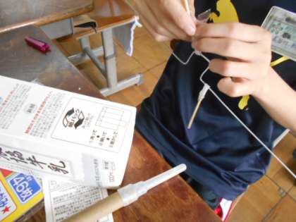 針金を曲げて牛乳パックに穴をあけて…クランクで動く仕組みができてきました。仕組みができると,イメージがわきやすいですね。