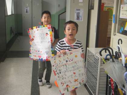 お店に来てもらうためには、『呼び込み』が大切です。手作りのポスターを持って、大きな声で自分のクラスのアピールを頑張っていました。来てくれたお客さんには、受付をして、ルール説明もしました。高学年のお兄さんやお姉さんたちは、しっかりと聞いてくれました。