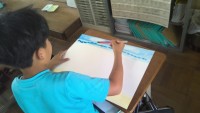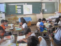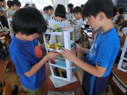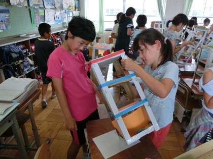 図画工作科で4段目迷路作りをしました。どんなテーマにするか,どんなコースにするか,思い思いに楽しんで作る姿が見られました。作りながらビー玉を転がして,転がる様子を確かめながらコース作りをしていました。トンネルや橋,扉やぼこぼこ道など,面白いコースや飾りに感心しました。最後にみんなでお互いの作品で遊んでよいところを見つけ合いました。