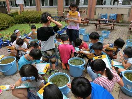 バケツに植えた稲の観察をしました。草丈や色などを調べながら「ちゃんと育つかなぁ。」「もう少し水減らした方がいいんちゃう。」などと言いながら観察していました。