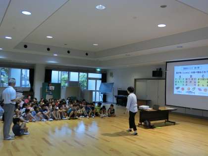 気候ネットワークの方々に地球環境について学びました。スライドで環境問題について知ったりクイズで身近なエコについて考えたりなど,改めてエコライフに関心を向けるよい機会になりました。「そういえば,北部クリーンセンターでもエコライザーから同じことを聞いたね。」「地球をすくのは君たち一人一人の行動にかかっている!」などと教室に帰ってから子どもたちと話をしました。夏休み中にお家の方と一緒にエコライフにチャレンジすることになっています。関心をもって取り組んでほしいと思っています。