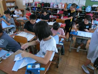 家庭科で学んだ波縫いを使い,ランチョンマットを縫っています。給食時間に使える日を楽しみにしています。