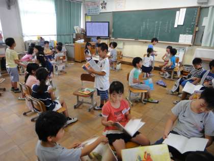 教科書の物語や,選んだ本で作ったクイズを出し合い