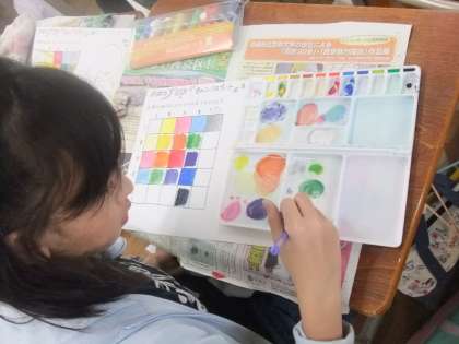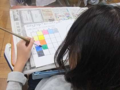 今,図画工作の学習では,「お話の絵」に取り組んでいます。次の時間からの彩色に向けて,3原色からの色の作り方を確認しました。