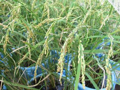 中庭のバケツ稲が実りの時を迎えています。