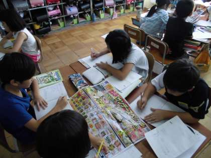 そこで,スーパーマーケットの工夫について考えました。チラシや普段の買い物の経験からグループで話合い,ノートにまとめていました。
