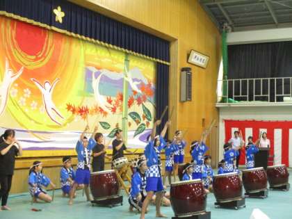 第2部のアトラクションでは,和太鼓部が勇ましい和太鼓の演奏を披露し,1年生がかわいらしいメッセージと歌を発表しました。