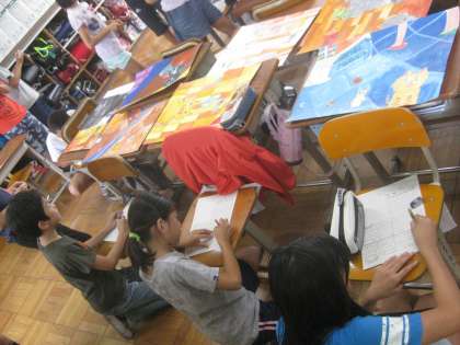 完成したお話の絵を並べて,クラスで鑑賞会を開きました。
