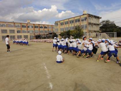 2年生は5年生と綱引きをします。