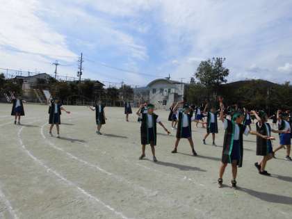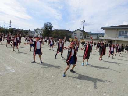 今日の練習ではハチマキをつけてハッピを着て,鳴子を持って本番と同じ格好で踊りました。ハッピを着ることで空気がピリッと張りつめます。鳴子の音が運動場に響きました。
