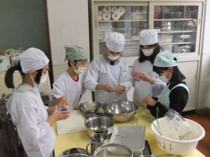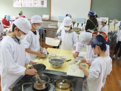 みそ汁は,にぼしでだしをとるところから始めました。食べやすい大きさに切ったり,味見をしたり,どのグループも協力しながら,楽しそうに調理をしていました。