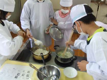 調理実習でご飯をお鍋で炊き,みそ汁を作りました。