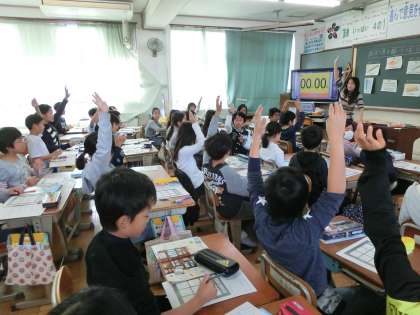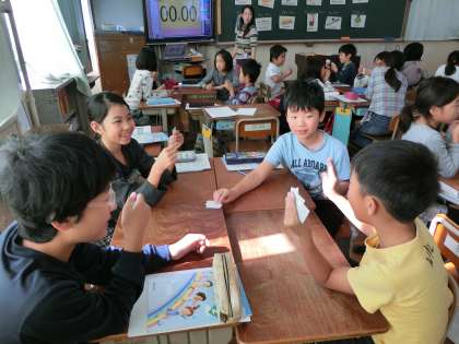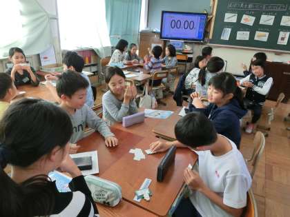 自分の文房具セットを作るために文房具の言い方にゲームを通して慣れ親しんでいます。みんなとても楽しそうです。