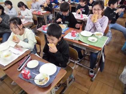 今日の給食はツナごぼうにマヨネーズを混ぜてパンにはさんで食べる献立でした。みんな口をあーんと大きく開けてパンを食べてしました。おいしい給食ごちそう様でした。
