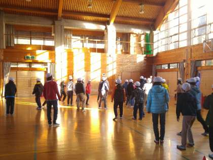 安全に活動できるようになるまで,クラス対抗のドッチビーをしました。