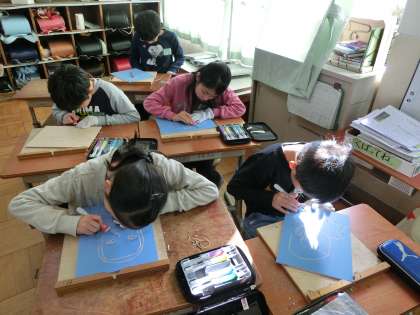 図画工作科で,初めての彫刻刀に挑戦しました。みんなドキドキわくわくしながら彫刻刀を手にし,彫刻刀の種類や彫跡,持ち方などを確かめました。実際に彫り進める際は,丁寧に慎重に作業し,集中する姿が見られました。その姿に,さすが4年生だなぁと感心しました。
