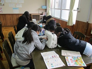 家庭科の学習でミシンを使って雑巾をつくっています。