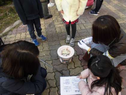七輪を使って餅を焼きました。炭に火が,なかなかつかなくて苦労してました。