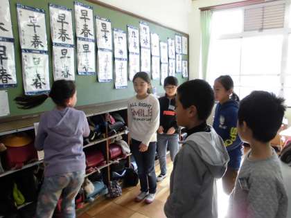 外国語では実際に体を動かしながら友だちに道案内をしてみました。「Go straight.」「Turn right.」「Turn left.」「Stop.」の4つの言葉を使って道案内です。実際に英語で友だちに道案内をするのは難しいですが,何度も繰り返し行って,少しずつ慣れていくことができました。