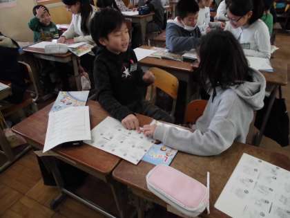 外国語の学習で,道案内をするための,学校内の教室等の言い方に慣れるため,ペアで「どんじゃんけんゲーム」をおこないました。順番に単語を言っていきながら,出会ったところでじゃんけん!友だちのスタート位置までたどり着くことができたら1ポイントゲットです。