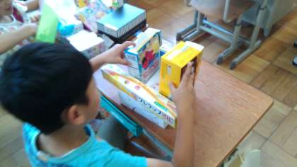 算数では様々な形の箱を使い,いろいろな形について学習をしています。今日は箱を積んだり,並べたりしながら乗り物や動物などの形を作る活動をしました。子どもたちは,「先生,お城ができたよ!」,「先生,飛行機ができたよ!」と楽しみながら学習をしていました。