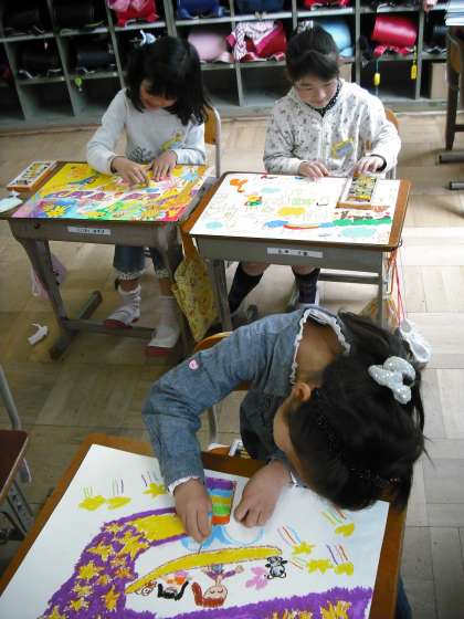 図工「いっぱい ゆめいっぱい」で、「あったらいいなあ、こんなことしたいなあ」と想像を膨らまし絵を描きました。