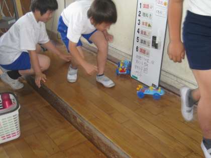 友達といっしょに教えあいながら,楽しく作ることができました。作った後は,教室で走らせてみました。その速いこと速いこと!競争して盛り上がる姿も見られました。