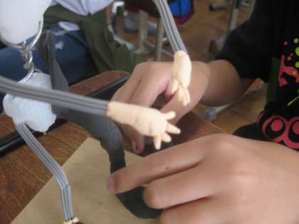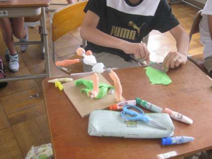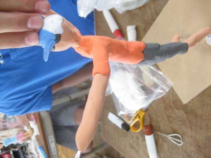 紙粘土に絵具を練りこんで色付き粘土を作っていきます。細かい指先まで作りこんだり,靴ひもを再現したりしています。