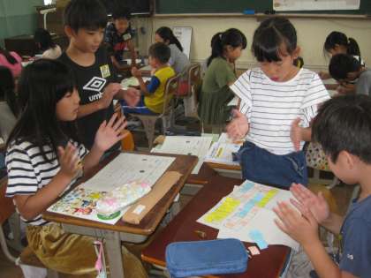 音楽科の学習で,4文字の言葉を使ってリズムアンサンブル作りをしました。グループで4文字の言葉を一つ決め,長さを変えたり,重ねたりしてアンサンブルを作っていきます。わいわい相談しながら,カードを並べたり手拍子で練習したり,楽しく活動している姿が見られました。