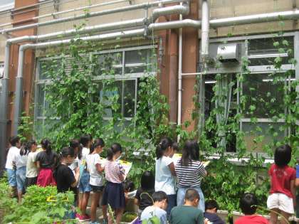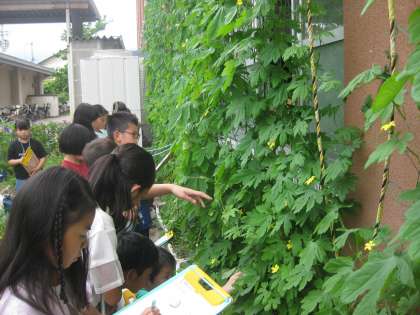 ツルレイシの様子を久々に見に行ってみると,その高さにびっくり!前回観察したときは自分の身長ぐらいだったものが,2階の教室に届きそうなところまで伸びていました。花がたくさん咲き,実ができてきているものもありました。みんな,「実ができた!」と喜んでいました。