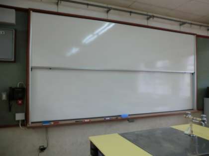 家庭科室のテーブルと黒板がリニューアルされました。テーブルは古くなり,板がはがれかけていましたが,新しい板に付け替えたところ,部屋全体が明るく見え,イメージが変わりました。黒板もホワイトボードに変えたので,チョークの粉が舞う心配がなくなりました。調理実習で使う時を楽しみにしています。