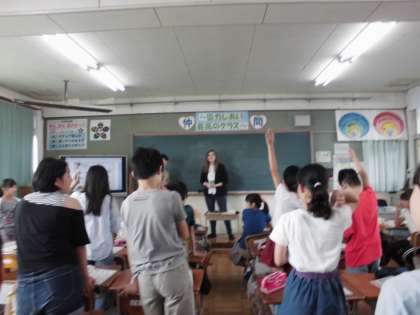 先生の質問に答えたり,伝言ゲームをしたり,楽しみながら活動しています。