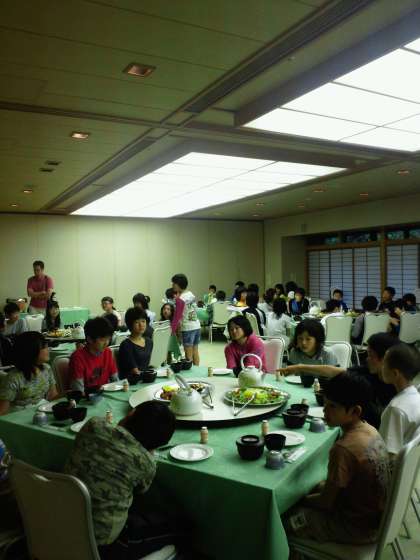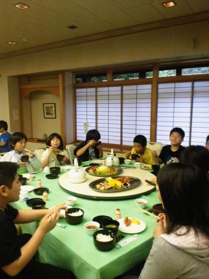 おはようございます。眠そうな顔の子もいますが,みんな元気です。朝食をしっかり食べて,今日の活動に向かいます。