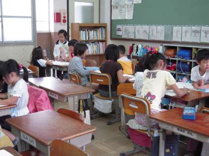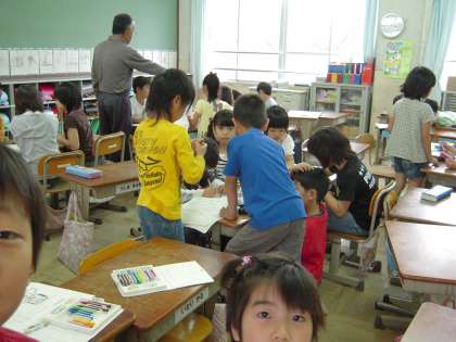 生活の学習で学校探検をするので、各教室の説明の看板を作っています。グループでインタビューに行って聞いてきたことをまとめて画用紙に書いています。先生の似顔絵がなかなかむずかしいようです。どんな看板ができたか、学校に来られたときに見てください。
