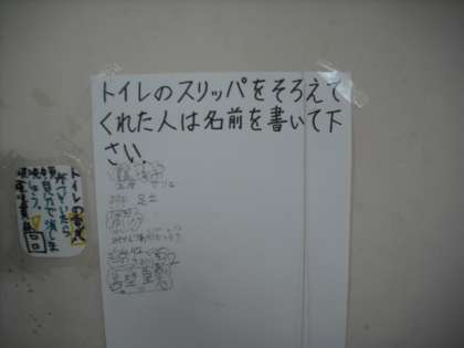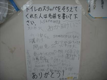 今日3年生のトイレを横切ろうとすると,スリッパをキレイにしてくれた人の名前を書くという張り紙を発見しました!!こんなにもたくさんの人がスリッパをキレイにそろえてくれているんですね。「先生!僕そろえたよ!」っと言ってくれたので「ありがとう」というとすごく嬉しそうな顔をしていました。素敵ですね☆