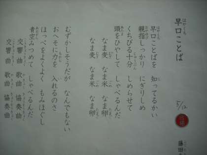 宿題でも出ていた早口言葉の暗唱発表をしました。みんな緊張しているのが伝わってきました。しっかり練習もしてきていました。