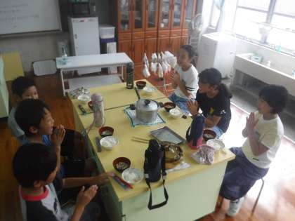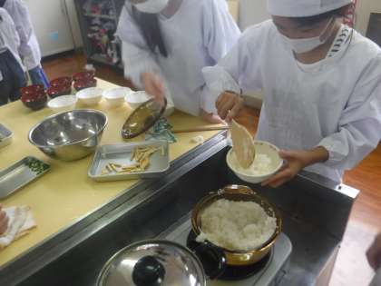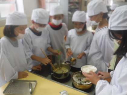 家庭科の調理実習でご飯とみそ汁を作りました。サラダに続き,2回目の実習なので仕事を分担し手際よくすすめられました。ごはんもおみそ汁も,とってもおいしかったですね。
