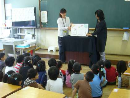 今日(18日)は3組へ。あいさつの後、さっそく読み聞かせが始まります。今日の絵本は木いちごメンバーの手作り、「おおきなどんぐり」のお話です。スケッチブックにかかれたかわいい絵のお話のおしまいには、見たことのある絵が・・・。