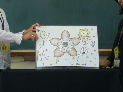 本物のどんぐりも出てきて、子どもたちは大喜び。樫原小学校の校章が出てくると、「ぼうしについてるマークや!」「中庭を空から見たら見えるマーク。」と口々に言っていました。