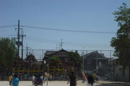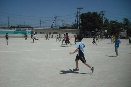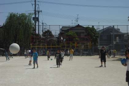 昼休みの1シーンです。太陽の日差しが降り注ぐ中,みんな元気に遊んでいます。