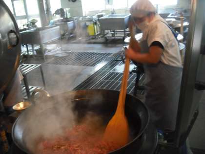 調理員さんが大きなしゃもじで肉や野菜を炒めているところをじっくり見ていました。